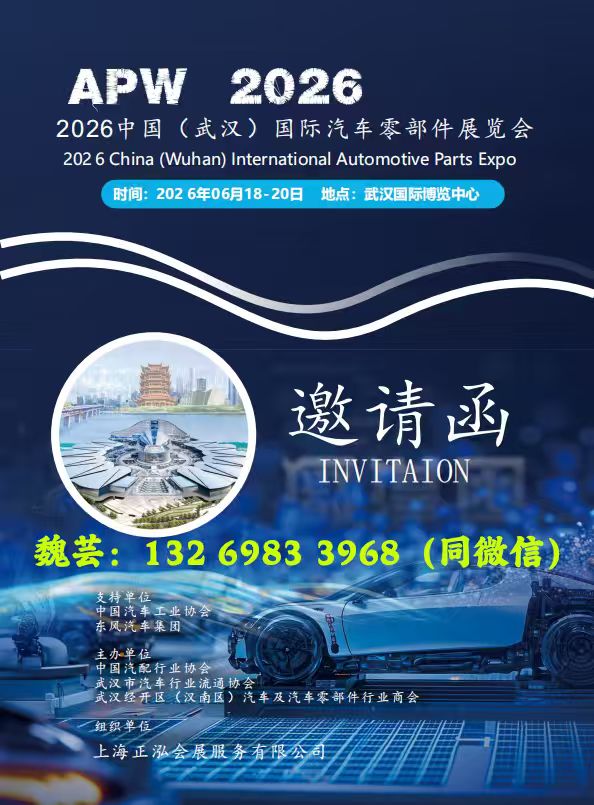 2026中國(guó)(武漢)國(guó)際汽車零部件博覽會(huì)時(shí)間:2026年6月18-20日地點(diǎn):武漢國(guó)際博覽中心邀請(qǐng)函支持單位:中國(guó)汽車工業(yè)協(xié)會(huì)、東風(fēng)汽車集團(tuán)主辦單位中國(guó)汽配行業(yè)協(xié)會(huì)、武漢市汽車行業(yè)流通協(xié)會(huì)、武漢經(jīng)開區(qū)(漢南區(qū))汽車及汽車零部件行業(yè)商會(huì)組織單位上海正泓會(huì)展服務(wù)有限公司展會(huì)背景